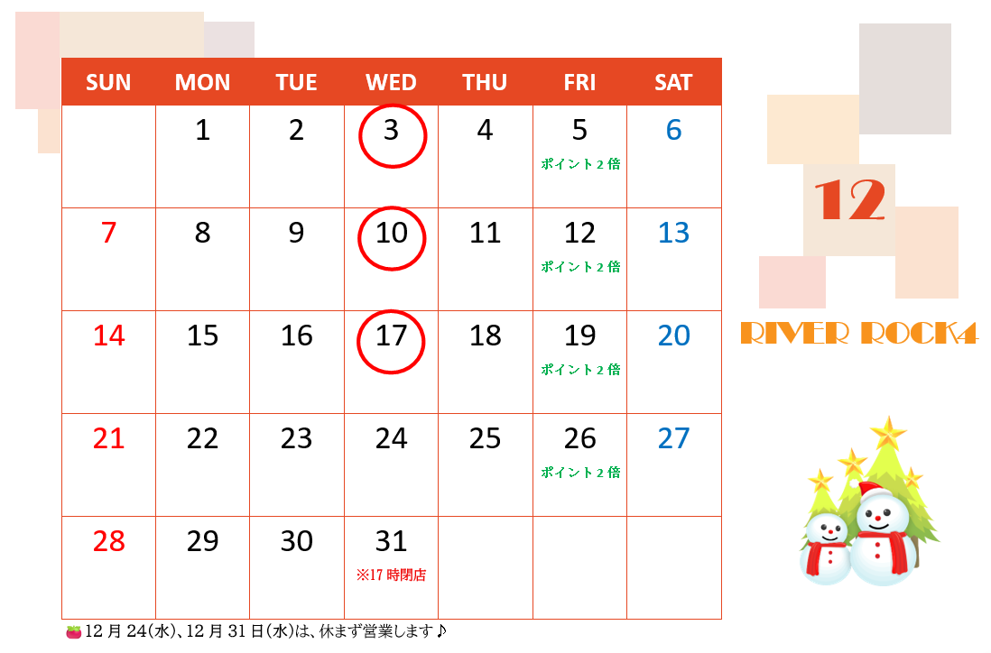 News ホーム > News > 🍅12月定休日のお知らせ 🍅12月定休日のお知らせ 2025/11/25 🎄クリスマスイブ(12/24)も、12/31も、営業致します!!! 毎週金曜日→ポイント2倍になります♪♪♪ ※〇が定休日となります 最近の投稿 2/12(木)リバーロック4渡利店お休みです バレンタインに特別なセットを・・・♡ 🍅2月定休日のお知らせ 🎍1/2(金)&1/3(土)は、お正月イベント開催します🎍 🍅1月定休日のお知らせ 月別投稿一覧 月を選択 2026年2月 (3) 2025年12月 (4) 2025年11月 (3) 2025年10月 (1) 2025年8月 (1) 2025年7月 (1) 2025年6月 (3) 2025年4月 (1) 2025年3月 (2) 2025年2月 (1) 2025年1月 (3) 2024年12月 (2) 2024年11月 (1) 2024年10月 (1) 2024年9月 (1) 2024年7月 (1) 2024年6月 (1) 2024年4月 (1) 2024年3月 (1) 2024年1月 (1) 2023年12月 (1) 2023年10月 (1) 2023年7月 (1) 2023年4月 (1) 2023年3月 (1) 2022年12月 (3) 2022年4月 (1) 2022年1月 (1) 2021年11月 (1) 2021年10月 (1) 2021年9月 (1) 2021年8月 (1) 2021年7月 (1) 2021年5月 (2) 2021年2月 (2) 2021年1月 (2) 2020年12月 (2) 2020年11月 (1) 2020年10月 (1) 2020年9月 (2) 2020年6月 (1)